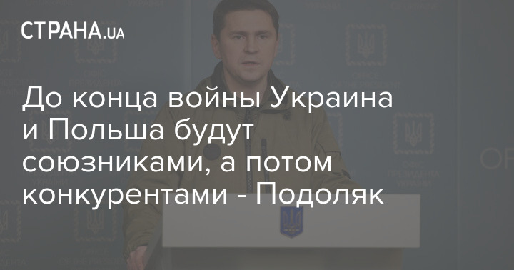 До кінця війни Україна та Польща будуть союзниками, а потім – конкурентами, заявив в ефірі телеканалу "Дом" радник глави Офісу президента Михайло Подоляк.