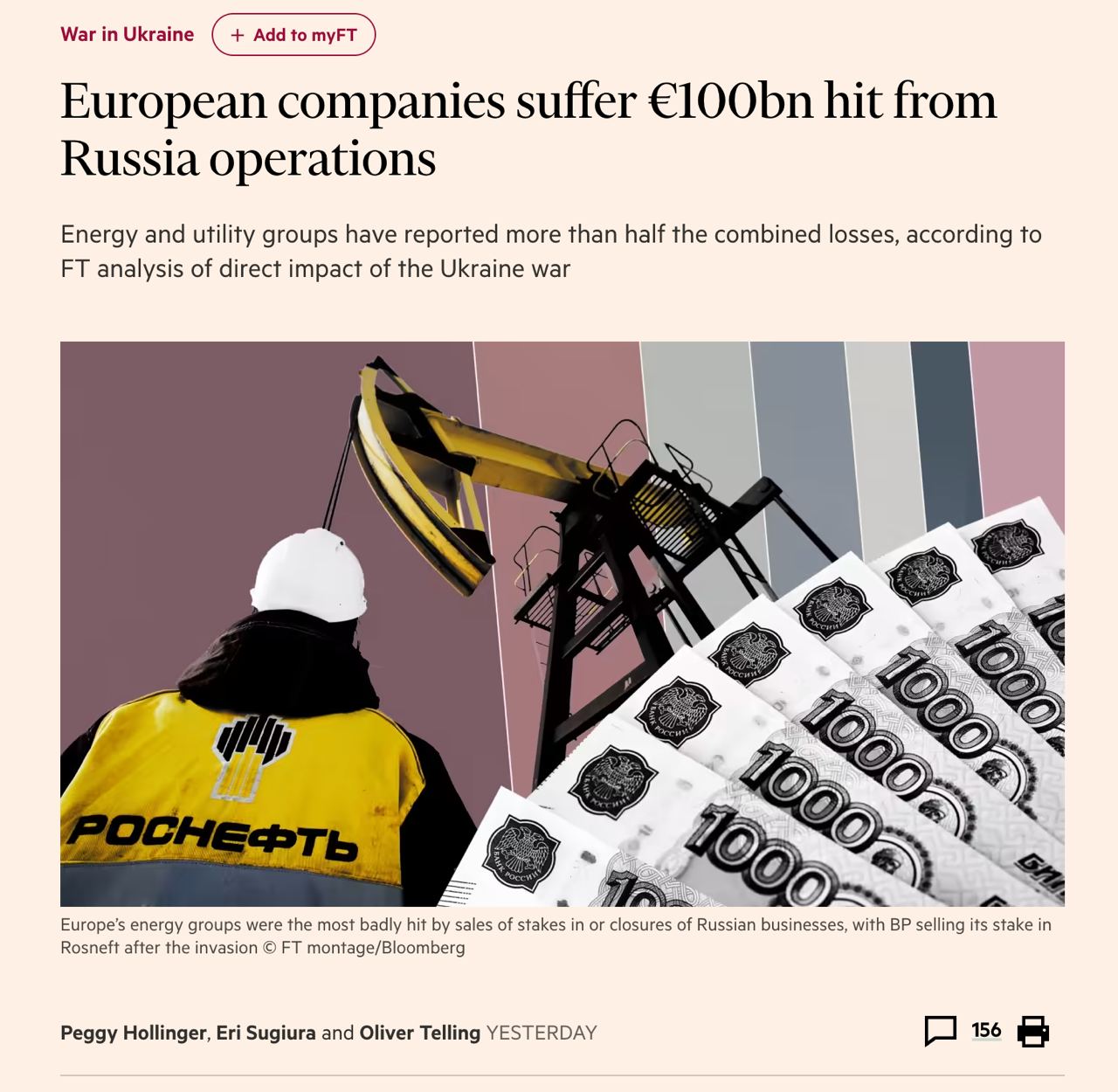 09.40 Найбільші європейські компанії втратили в РФ щонайменше 100 млрд євро після її вторгнення в Україну, пише Financial Times.