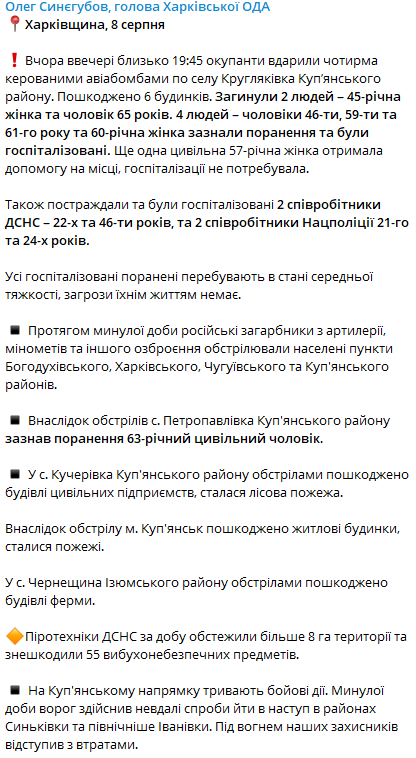 У Кругляківці Куп'янського району Харківської області станом на ранок вівторка 8 серпня відомо про двох загиблих та дев'ятьох постраждалих внаслідок вчорашніх обстрілів.