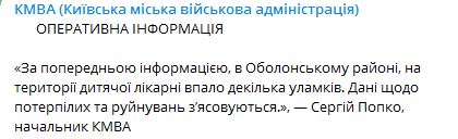 "За попередньою інформацією, в Оболонському районі, на території дитячої лікарні впало кілька уламків. Дані про постраждалих та руйнування з'ясовуються", - повідомив голова КДВА Сергій Попко.