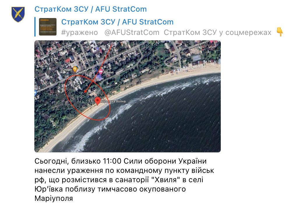 Незабаром у ЗСУ підтвердили удар по Юріївці. Стратком заявив, що було вражено командний пункт військ РФ у санаторії "Хвиля".