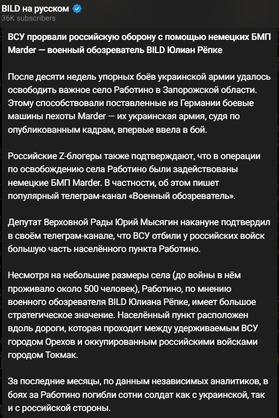 ЗСУ звільнили село Роботине на горіхівському напрямі під Запоріжжям. Зробити це вдалося за допомогою німецьких БМП Marder. Судячи з опублікованих відео, Україна вперше ввела їх у бій.