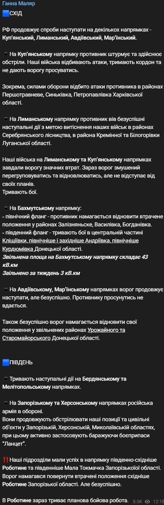 Заступниця міністра оборони України Ганна Маляр заявила про просування ЗСУ на південний схід від Роботино на Оріхівському напрямку.