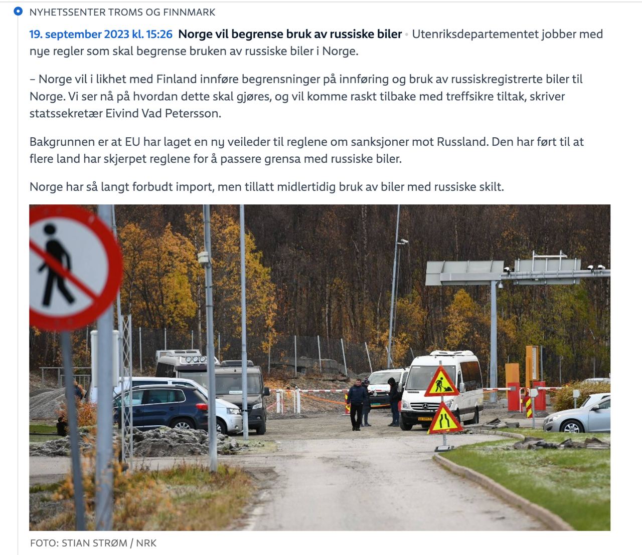 Зазначимо, що Норвегія залишалася останньою країною шенгенської зони, що межує з РФ, яка ще не заборонила в'їзд автомобілів з російською реєстрацією.