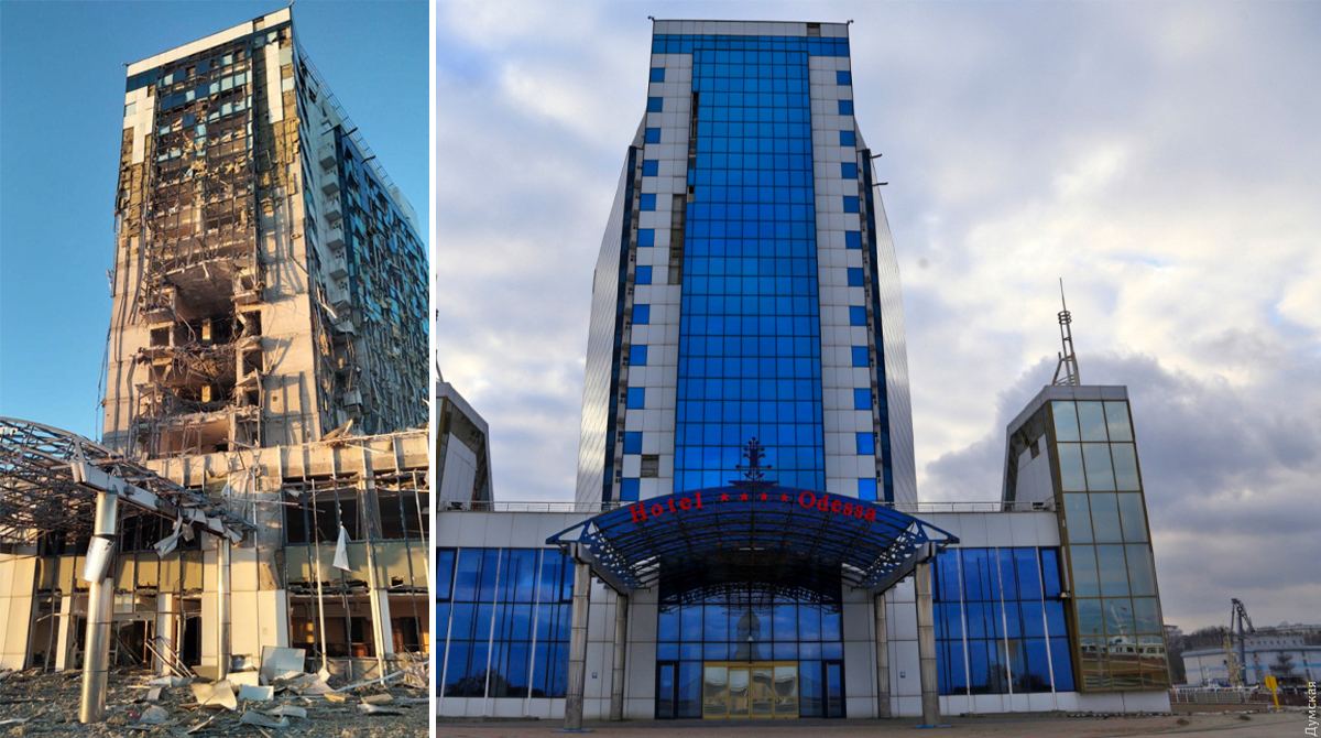 09.32 Фото готелю «Одеса» до та після нічного прильоту та пожежі.