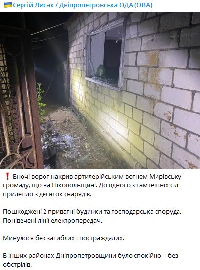 07.32 Вночі росіяни накрили артилерійським вогнем Мирівську громаду Нікопольського району Дніпропетровської області.