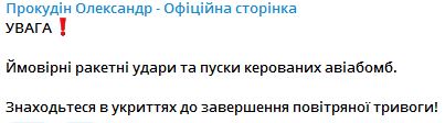 08.25 У Херсонській області попереджають про ймовірний пуск ракет та керованих авіабомб.