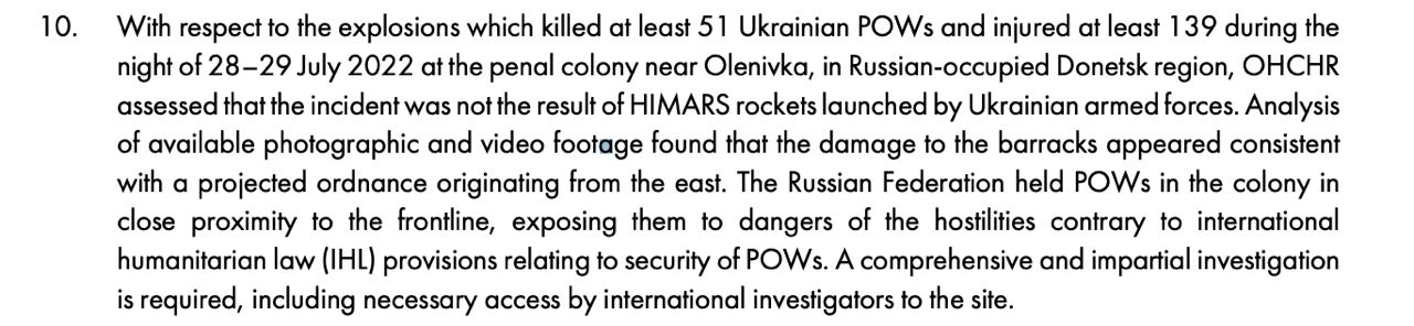 Експерти ООН вважають, що по колонії з українськими військовополоненими в Оленівці в липні минулого року удар завдала не ракета HIMARS, як це стверджує РФ.