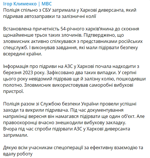 Поліція спільно із СБУ затримала у Харкові диверсанта, якого підозрюють у тому, що він підривав автозаправки та залізничні колії.