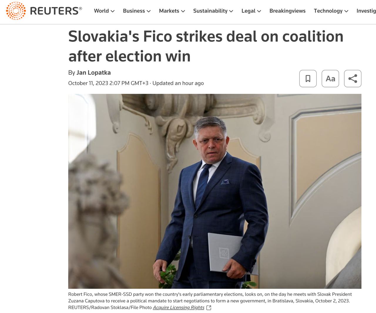 Сьогодні вранці ми повідомляли, що партія Роберта Фіцо, яка перемогла на виборах у Словаччині, практично зібрала коаліцію.