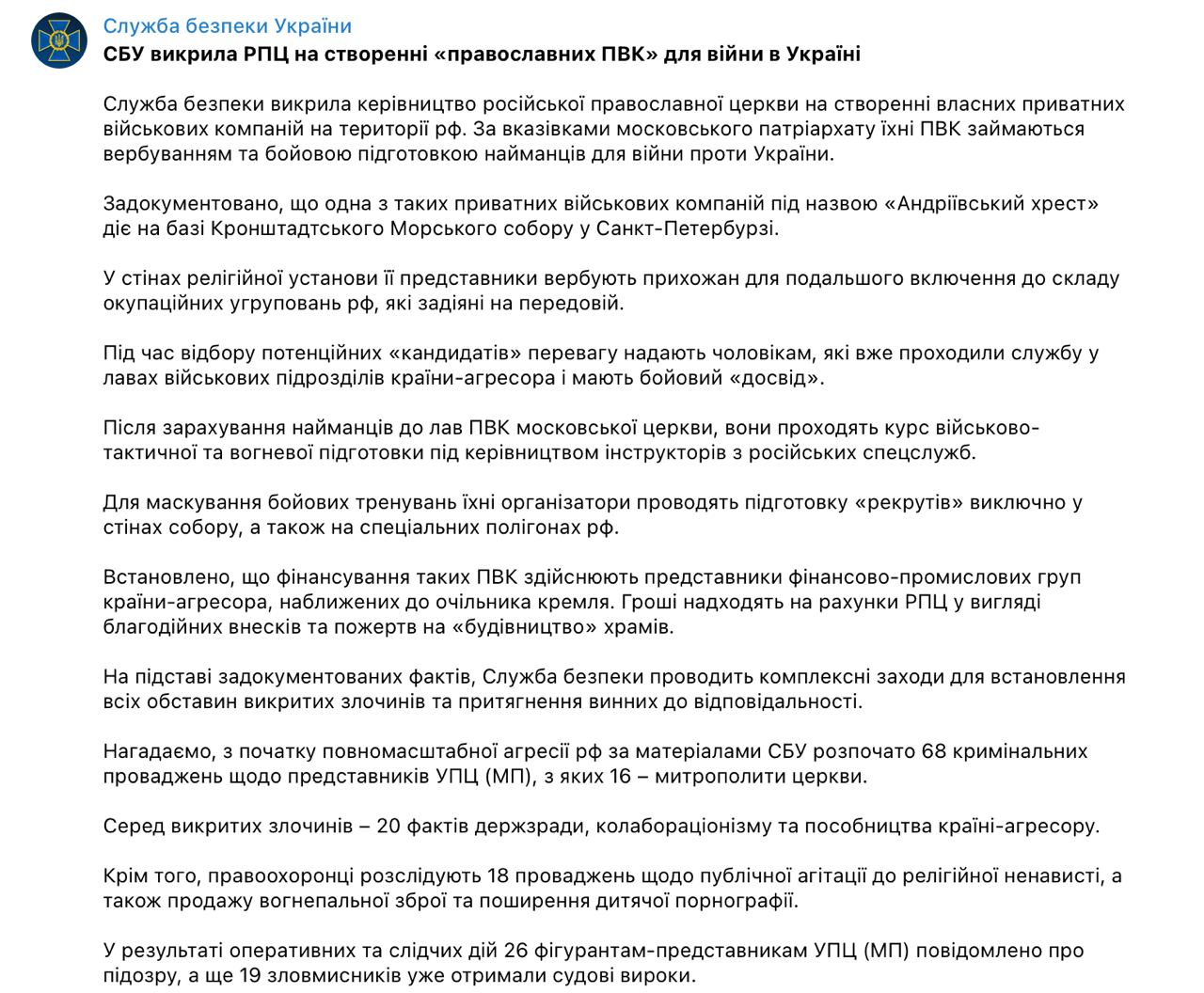 СБУ повідомляє, що РПЦ створює "православні ПВК" для війни в Україні.