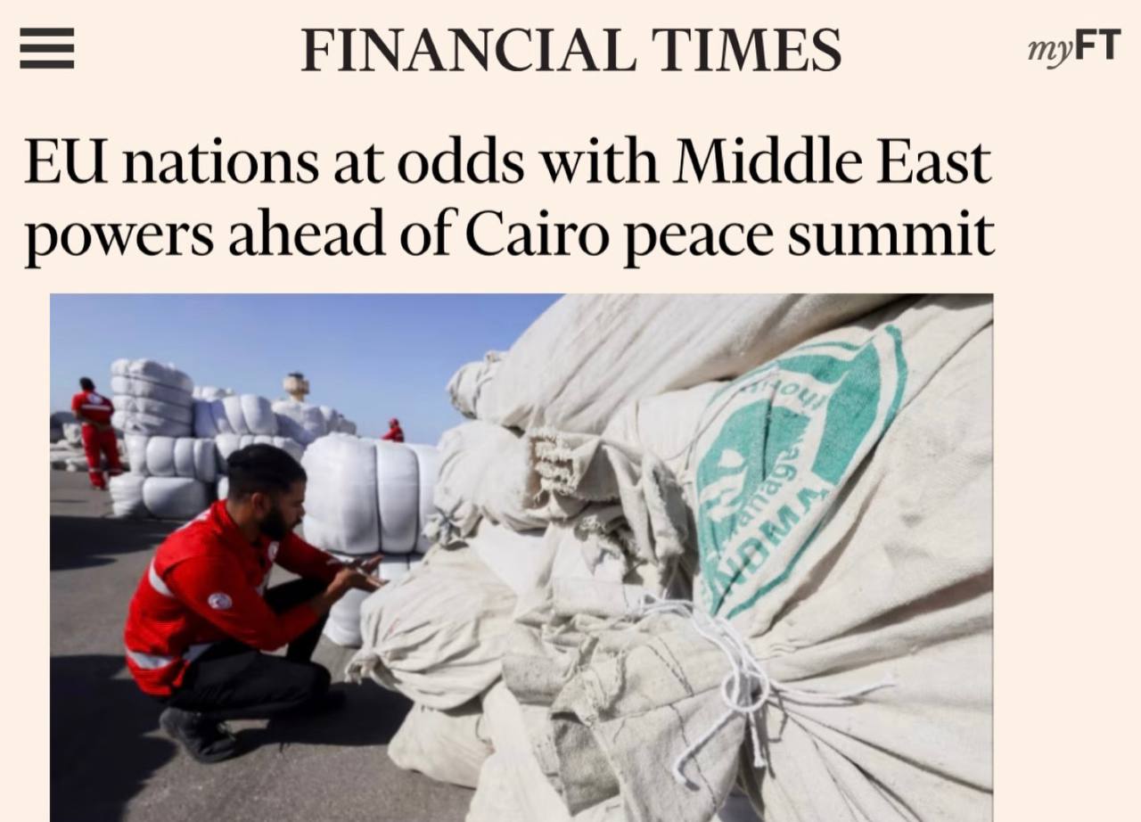 "На мирному саміті в Каїрі минулими вихідними країна за країною обрушувалися на представників ЄС (лідерів Італії, Іспанії, Греції та Кіпру, а також голови Ради Євросоюзу, його головного дипломата та міністрів закордонних справ Франції та Німеччини). Їх різко звинувачували у подвійних стандартах та лицемірства, оскільки вони засуджували порушення гуманітарного права Росією, але не Ізраїлем.