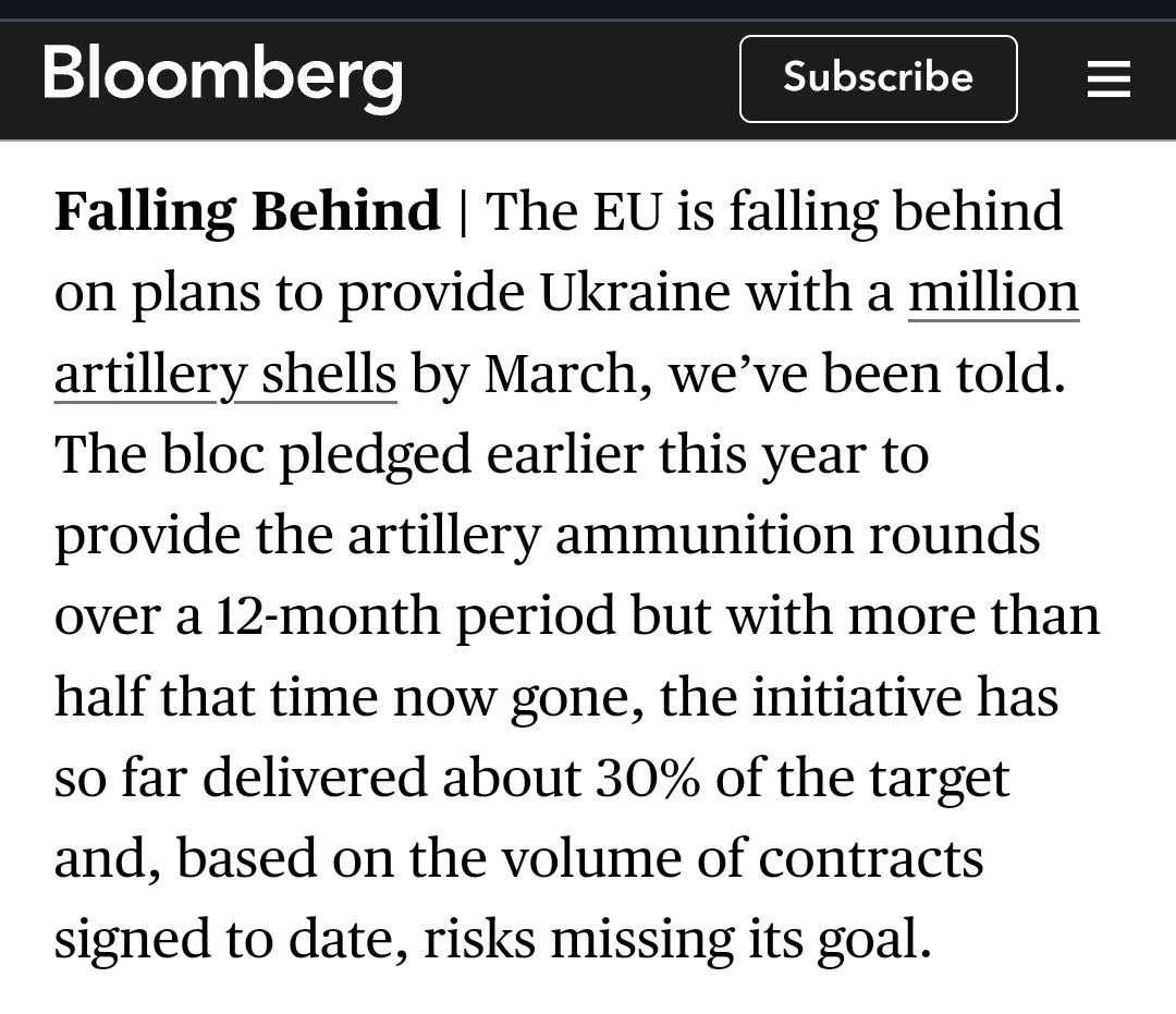 Минулої весни ЄС зобов'язався поставити артилерійські боєприпаси протягом 12-місячного періоду. Але вже минуло понад половину цього терміну, і за цей час вдалося надіслати Києву лише 30% від обіцяного.
