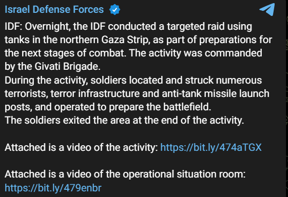 Ізраїльська армія показала кадри танкового рейду на території сектору Газа. За даними ЦАХАЛ, танки увійшли на північ палестинського анклаву, завдали ряд ударів та повернулися на територію Ізраїлю.