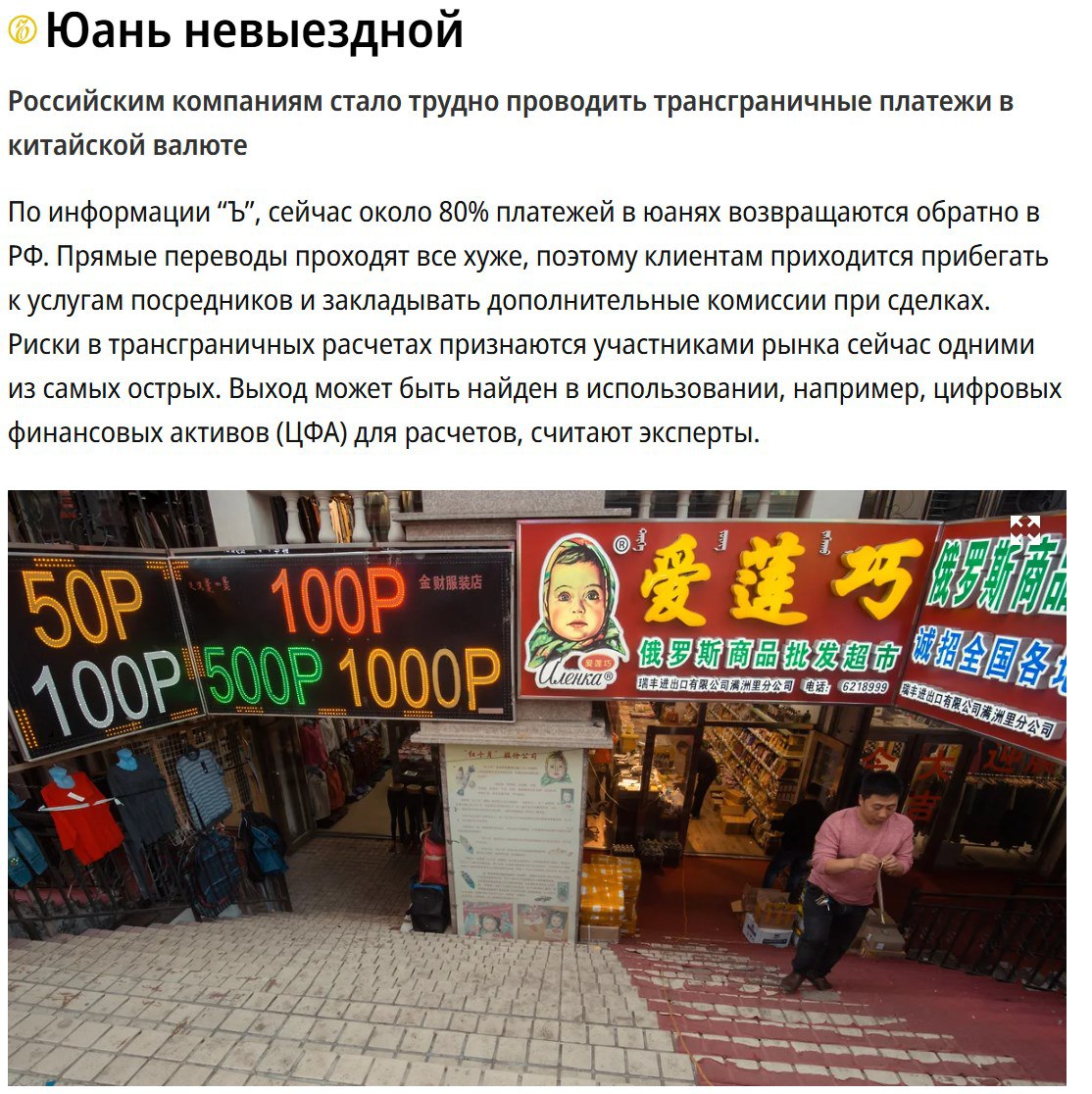 За інформацією "Комерсанта", зараз близько 80% платежів у юанях повертаються назад до РФ.