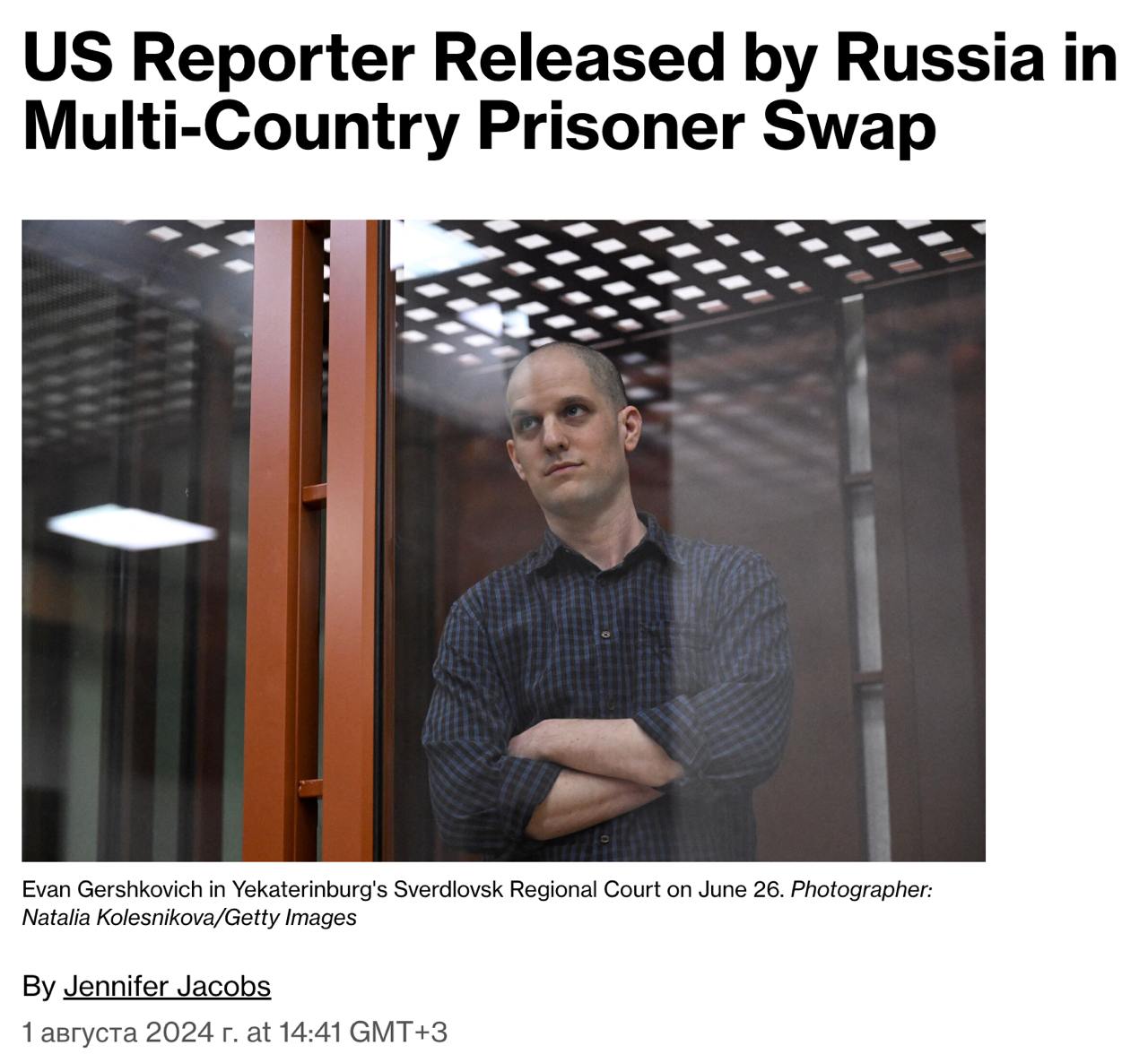 Bloomberg повідомляє, що Росія звільнила американського журналіста WSJ Евана Гершковича та колишнього морпіха США Пола Уїлана у рамках сьогоднішнього обміну.