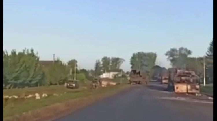 У мережі публікують відео, як повідомляється, атакованої ракетами HIMARS російської колони техніки в районі Рильська Курської області.