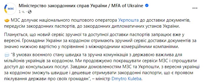 Міністерство закордонних справ долучає "Укрпошту" до доставки документів, насамперед закордонних паспортів, до закордонних дипломатичних установ України.
