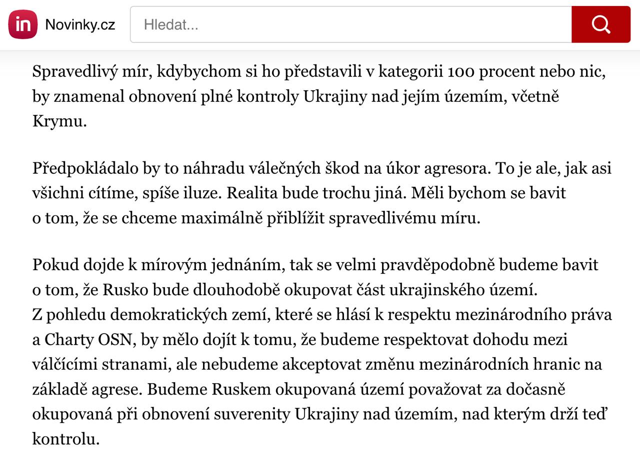 "Справедливий мир, якщо уявити його в категорії "100 відсотків або нічого", означав би відновлення повного контролю України над своєю територією, включаючи Крим. Він би включав компенсацію військової шкоди за рахунок агресора. Але, як ми, напевно, всі відчуваємо, це швидше за ілюзія. Реальність буде трохи іншою", - сказав президент Чехії.