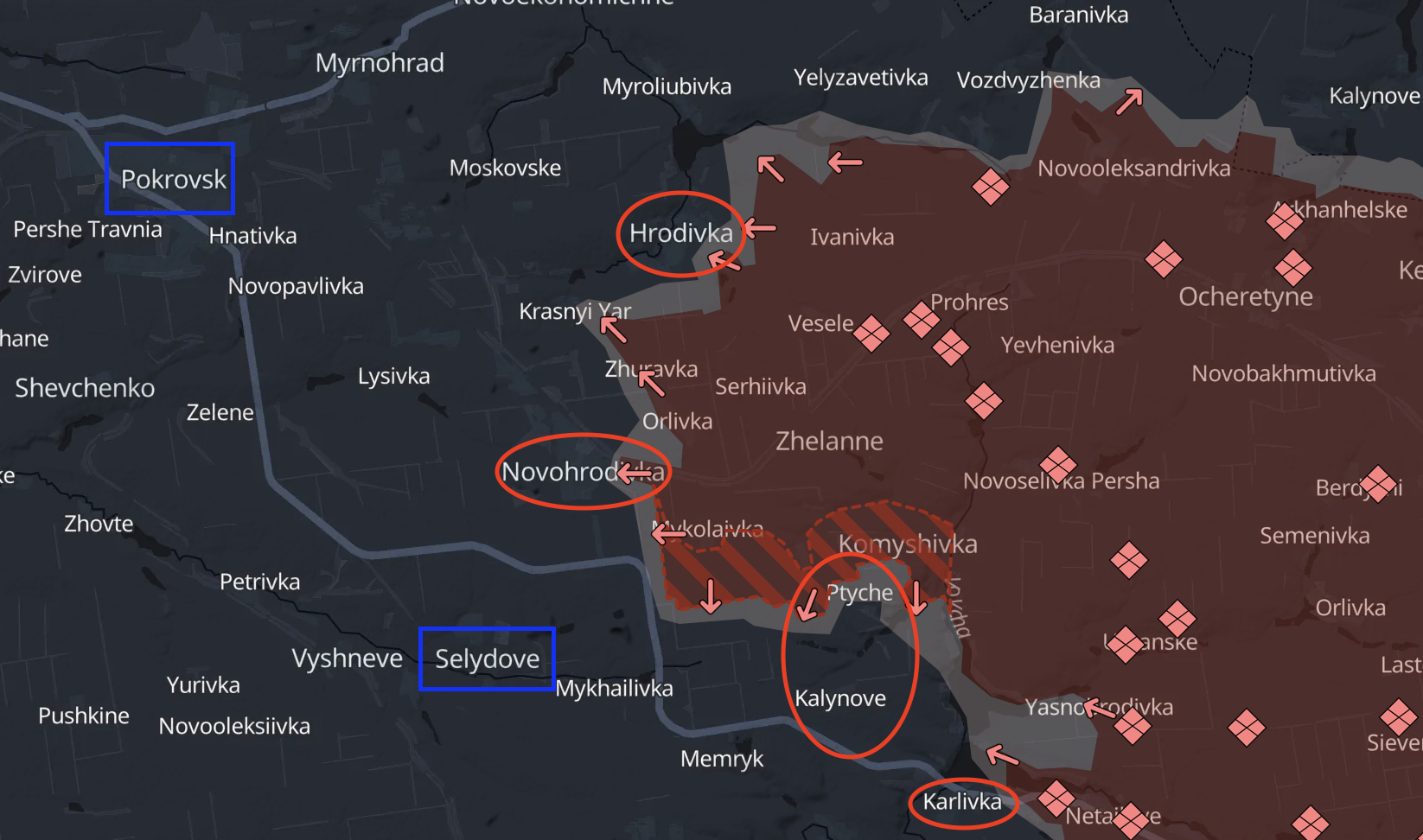 Зважаючи на все, те саме значення має просування РФ на захід від боку захопленої Миколаївки. Весь цей напрямок у бік траси, що веде з Карлівки до Селидового.