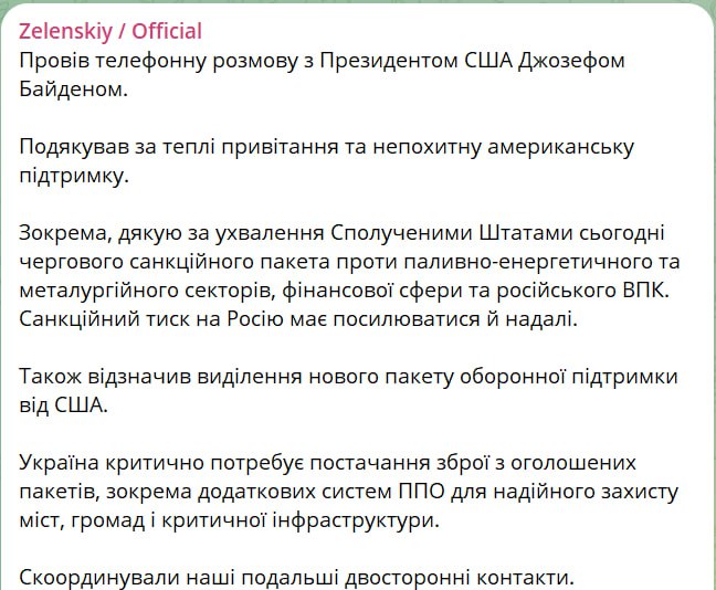 Зеленський опублікував свою версію повідомлення про телефонну розмову з Байденом. Він заявив, що "Україна критично потребує постачання зброї з оголошених пакетів, зокрема додаткових систем ППО".