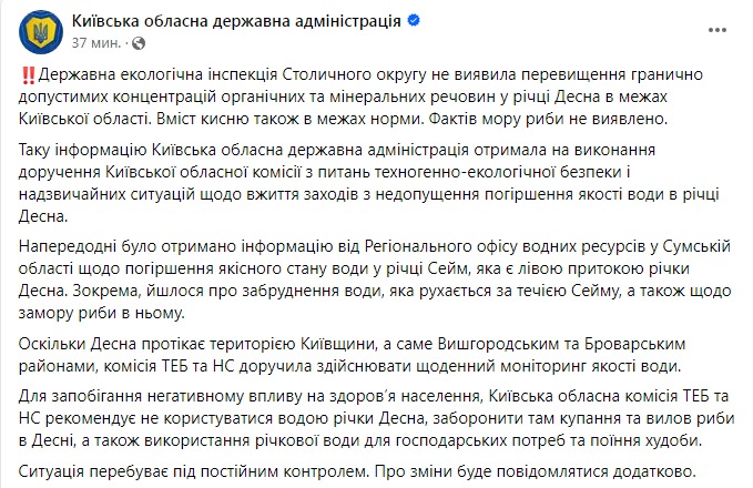 Згодом Київська обласна державна адміністрація у тій же соцмережі повідомила, що Державна екологічна інспекція Московського округу не виявила перевищення гранично допустимих концентрацій органічних та мінеральних речовин у річці Десна у Київській області. Зміст кисню також у межах норми. Фактів моря риби не виявлено.