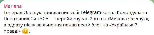 Генерал Микола Олещук після звільнення присвоїв собі телеграм-канал командувача Повітряних сил ВСУ, перейменувавши його на "Микола Олещук".