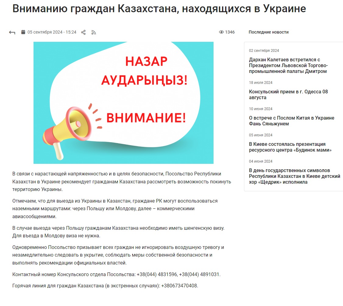 "У зв'язку з наростаючою напруженістю та з метою безпеки посольство Республіки Казахстан в Україні рекомендує громадянам Казахстану розглянути можливість залишити територію України. Зазначаємо, що для виїзду з України до Казахстану громадяни РК можуть скористатися наземними маршрутами через Польщу чи Молдову, далі – комерційними авіасполученнями. У разі виїзду через Польщу громадянам Казахстану необхідно мати шенгенську візу. Для в'їзду до Молдови віза не потрібна", йдеться у попередженні.