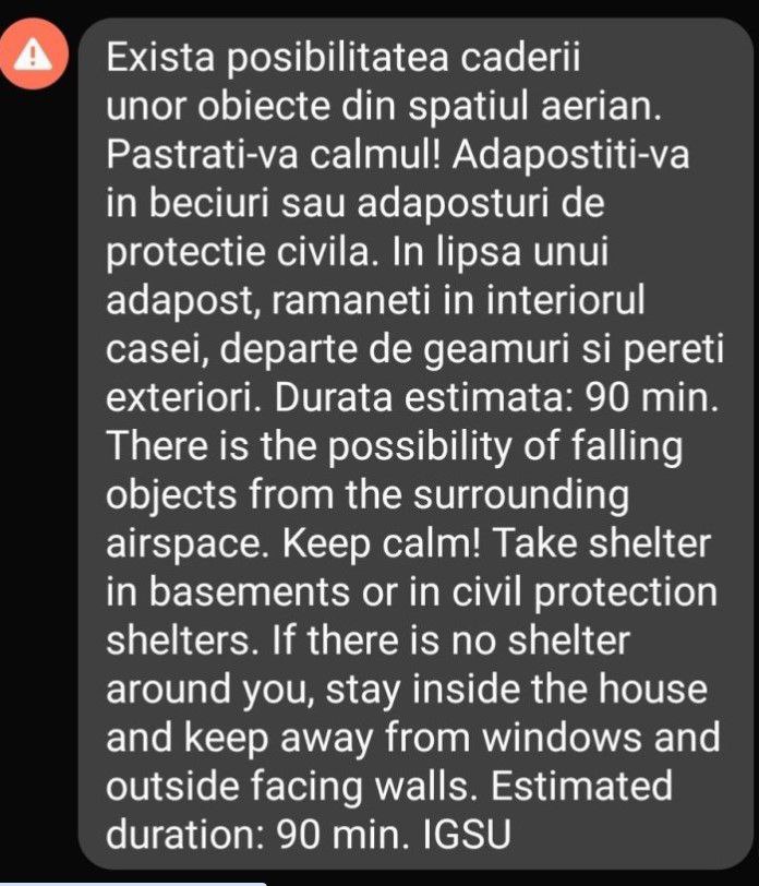 Румунська влада вночі попередила мешканців сусідніх Тулчі та Констанци про "ризику падіння об'єктів з повітряного простору після нападу РФ на Україну поблизу кордону з Румунією" (на скріншоті).