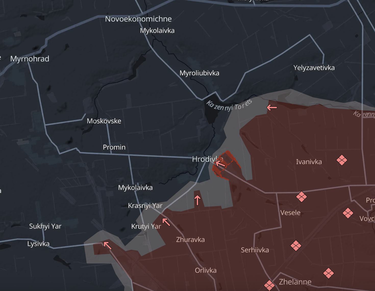 На Покровському напрямку росіяни, за даними Deep State, просунулися у Гродівці, зайнявши приблизно третину населеного пункту, з якого веде дорона на Мирноград.
