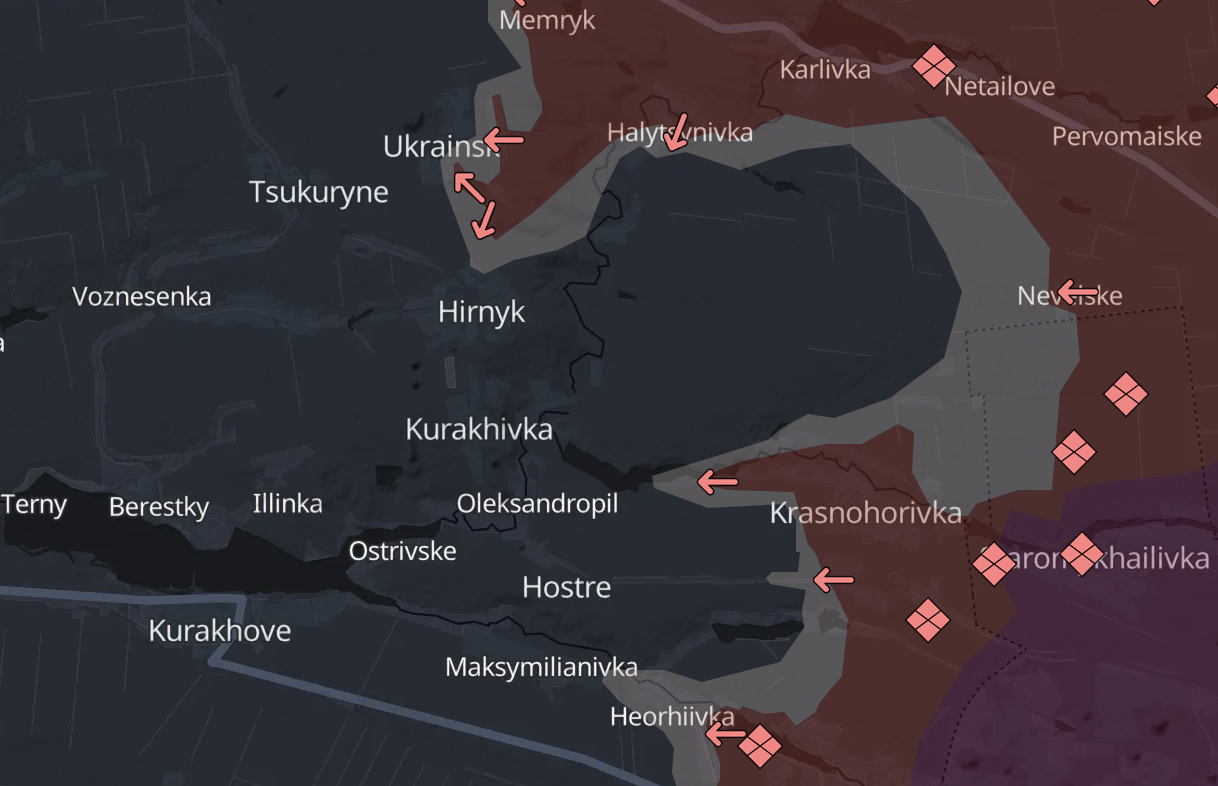 При цьому на південному фланзі Покровського виступу російські війська продовжують атакувати у бік Курахового - ведуть штурм українців та бої на підступах до Гірника.