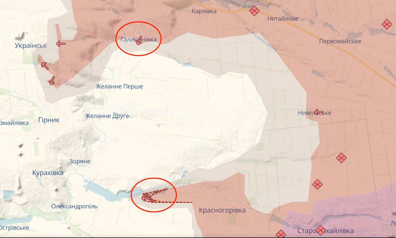Красногорівка та Галицинівка з півдня та півночі охоплюють район Невельського, де Росія намагається оточити українські підрозділи.