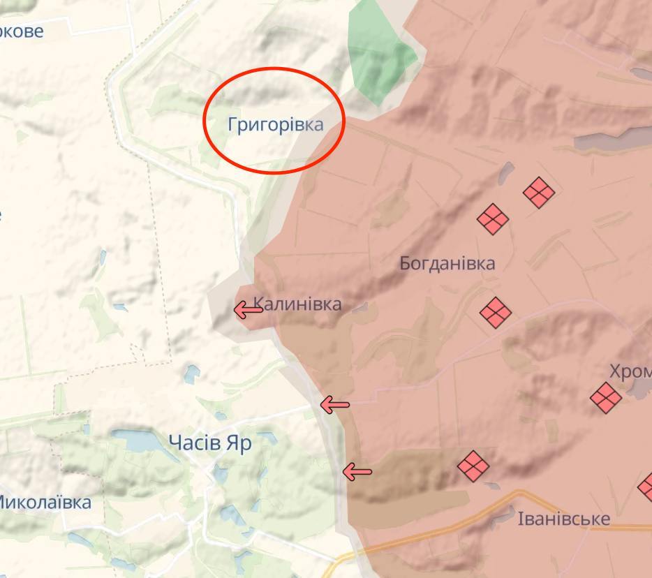 Григорівка знаходиться на північ від Часового Яру. На карті DS зазначено, що село знаходиться на лінії фронту, але залишається під контролем ЗСУ.