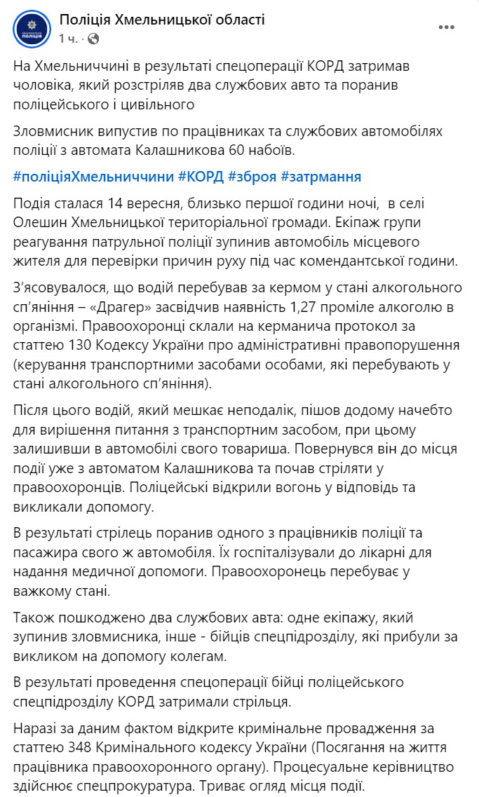 На Хмельниччині затримано чоловіка, який відкрив вогонь по поліцейських з автомата Калашнікова. Він поранив поліцейського та цивільного.