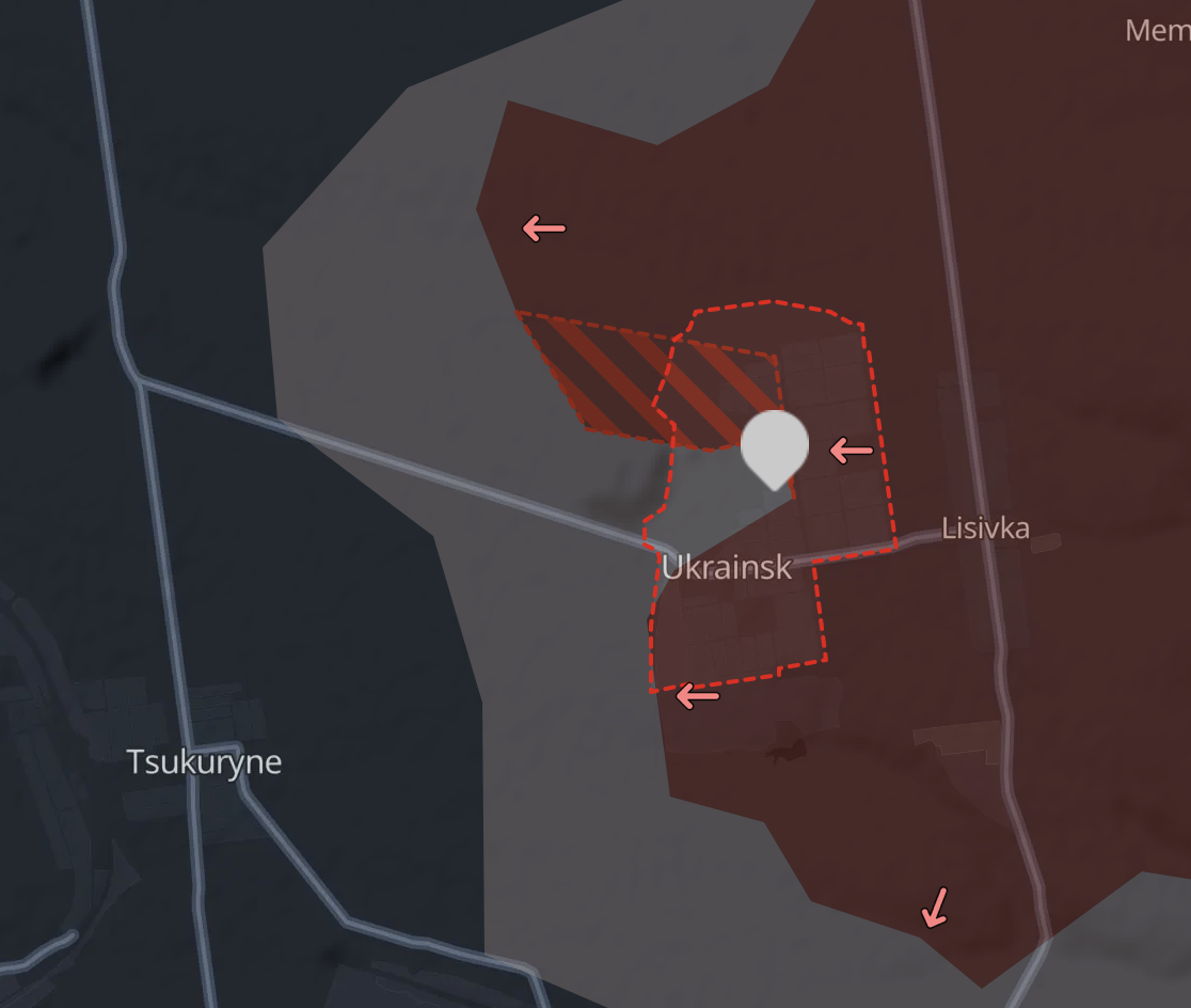 На південь від межі втрати місто Українка - судячи з карти Deep State, залишилася лише невелика ділянка, де йдуть бої у північно-західній частині. Російські паблики вчора заявили, що контролюють уже весь населений пункт та показали фото зі своїм прапором на головному вентиляційному стволі шахти "Україна" - ключовому пункті оборони українців.