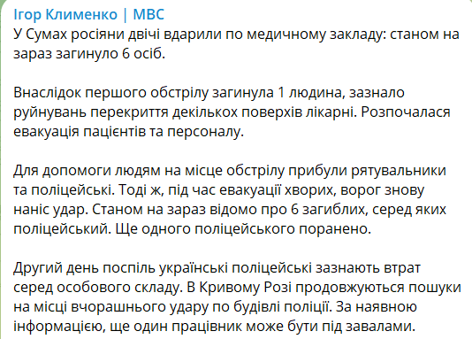 Сьогодні вранці росіяни двічі вдарили по медичному закладу в Сумах. Загинуло шестеро людей. Про це повідомляє міністр внутрішніх справ Ігор Клименко.