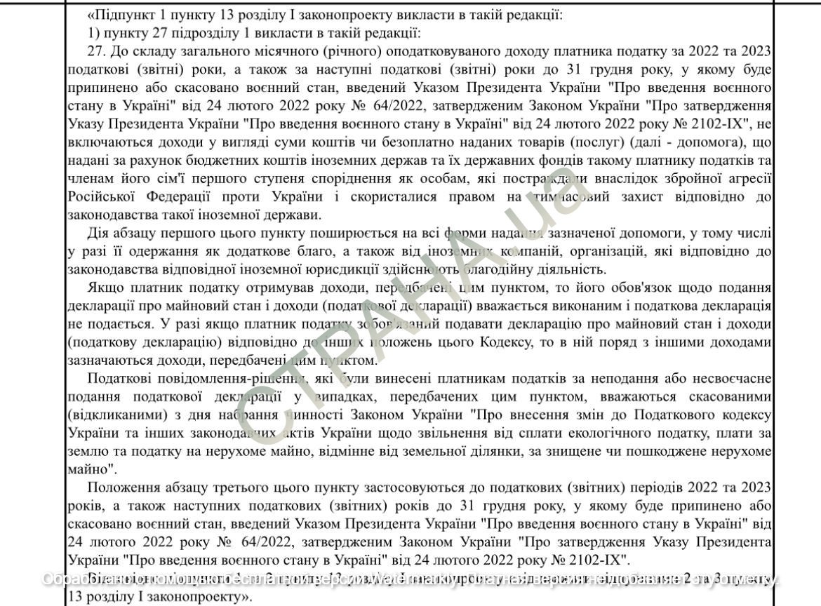 У проекті йдеться, що платники податків за 2022 та 2023 податкові роки, а також за наступні податкові роки аж до кінця року, в якому буде припинено або скасовано військовий стан, не повинні декларувати допомогу, надану за рахунок бюджетних коштів іноземних держав для осіб, які користувалися правом на тимчасовий захист.