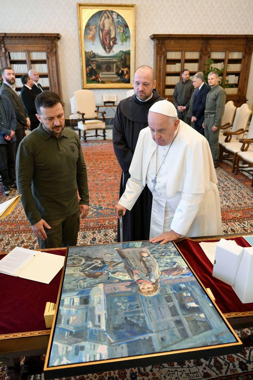 Ватикан повідомляє, що Зеленський вручив Франциску картину "Бучанська різанина: історія Марічки".
