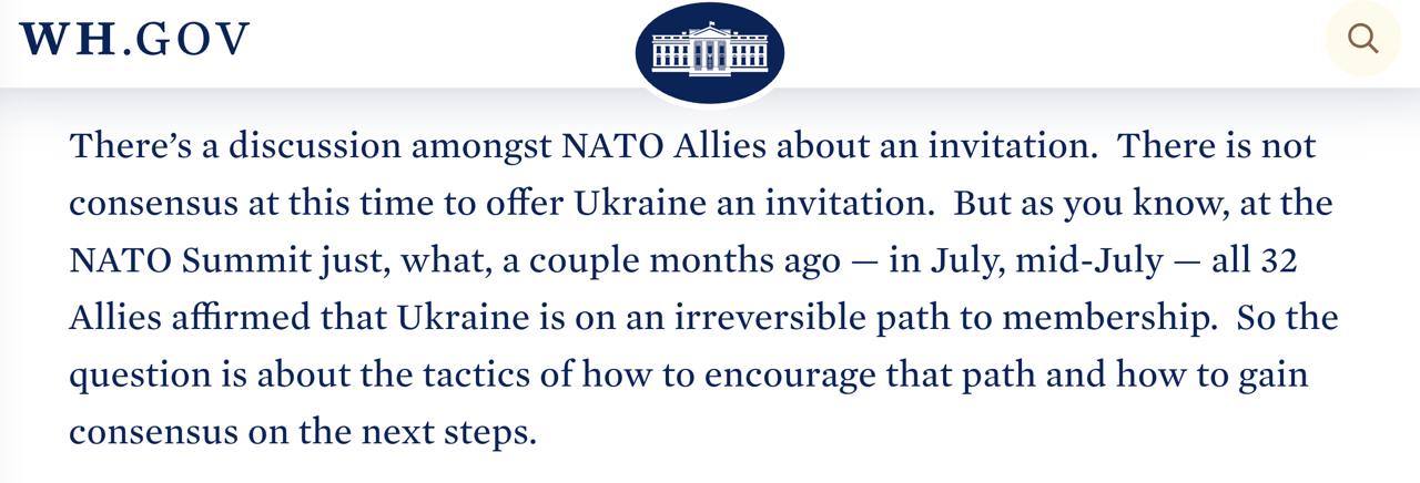 "Серед союзників щодо НАТО йде дискусія про запрошення. Наразі немає консенсусу щодо того, щоб запропонувати Україні запрошення. Але, як ви знаєте, на саміті НАТО в середині липня всі 32 союзники підтвердили, що Україна перебуває на незворотному шляху до членства. Тому питання у тактиці того, як заохочувати цей шлях і як досягти консенсусу щодо наступних кроків", - заявив на брифінгу представник адміністрації Байдена.