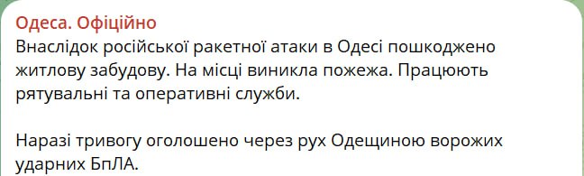 23.51 Внаслідок вечірньої ракетної атаки по Одесі пошкодження є у трьох місцях, повідомляє місцева влада: