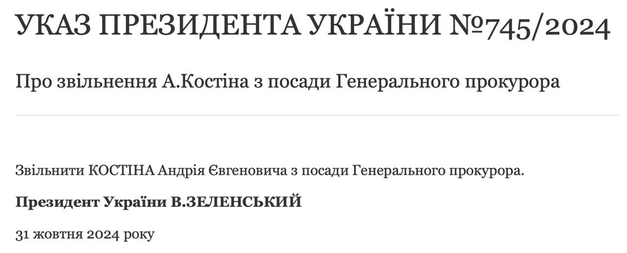 "Звільнити Костіна Андрія Євгеновича з посади генерального прокурора", - йдеться в указі.