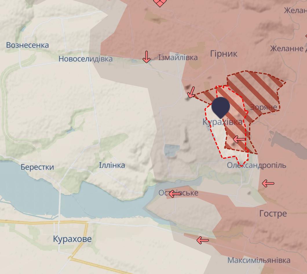 Сьогодні лейтенант ЗСУ із позивним "Алекс" заявив, що армія РФ «фактично зайняла» Курахівку. Карта Deep State підтверджує суттєве просування росіян на цій ділянці та повне захоплення сусіднього Зоряного. По Курахівці вказано, що половина селища знаходиться в сірій зоні, яка тягнеться далеко на захід, аж до підступів Іллінки.
