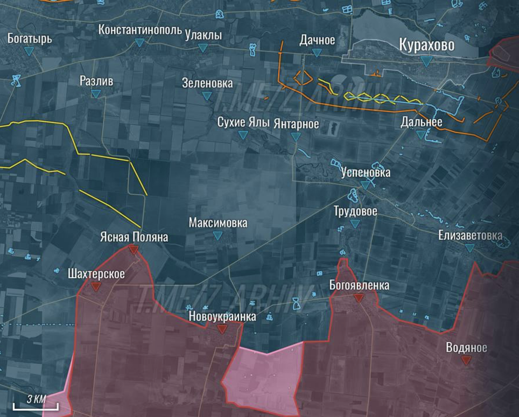 Також продовжуються атаки з метою обійти Курахове з півдня. Міноборони РФ заявляє про захоплення російськими військами Ясної Поляни на Донеччині. Це населений пункт на півдні, через який йде наступ РФ у бік Константинополя з метою перерізати дорогу на Курахове із заходу.