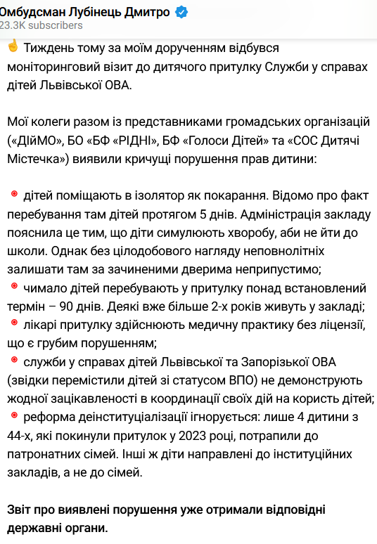 Омбудсмен повідомив про порушення у притулку для дітей у Львові. Фото: t.me/dmytro_lubinetzs