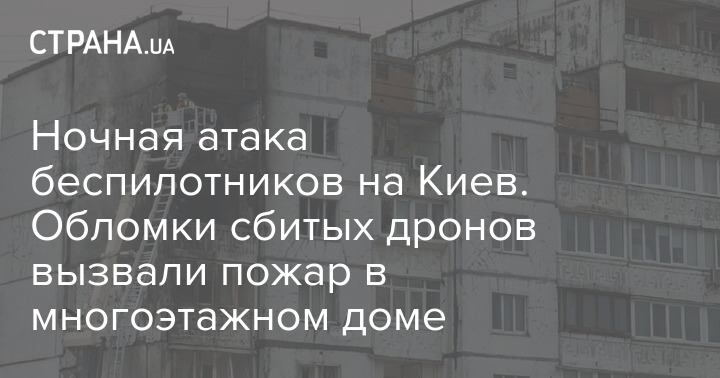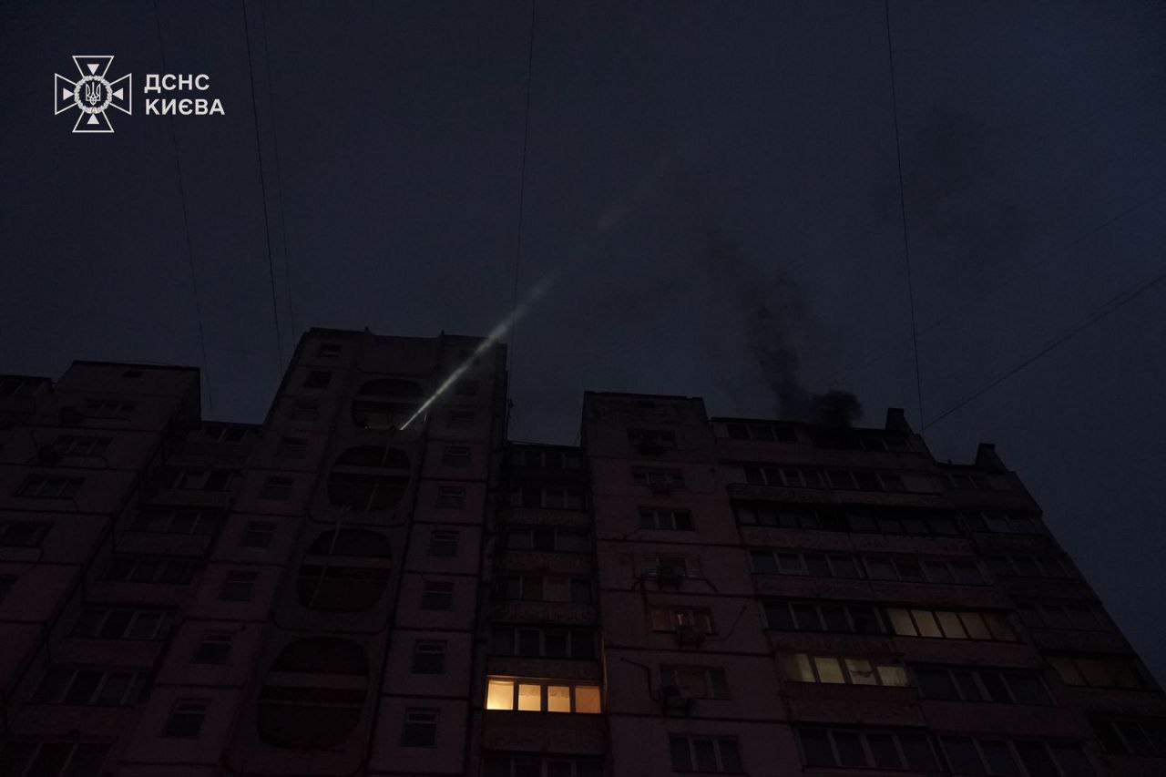 Нічна атака безпілотників на Київ. Уламки збитих дронів викликали пожежу у багатоповерховому будинку