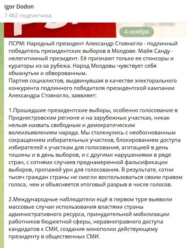 Заяву політсили опублікував у своєму телеграм-каналі екс-президент країни Ігор Додон.