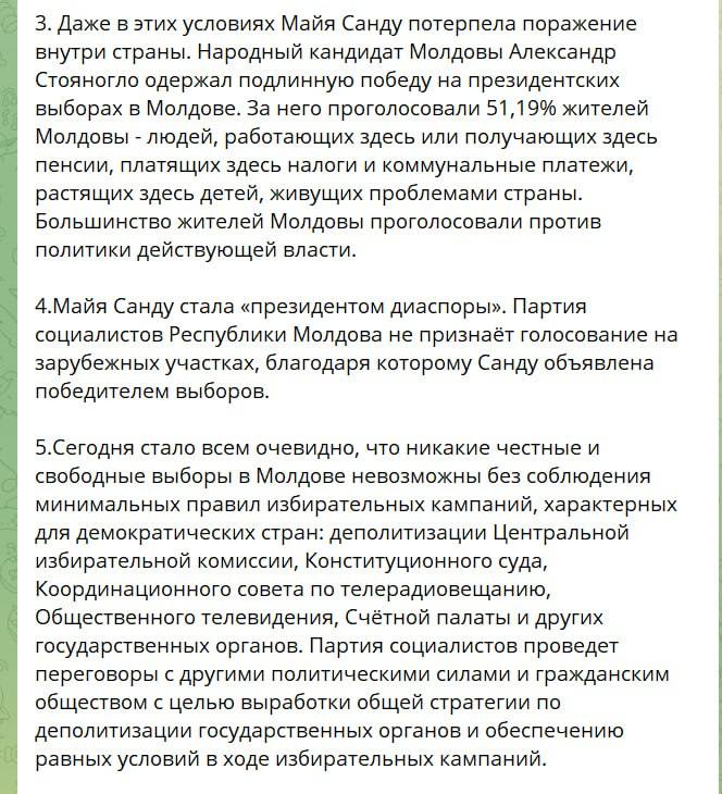 Партія соціалістів Республіки Молдова, від якої висувався юрист Олександр Стояногло, назвала Майю Санду "нелегітимним президентом" та заявила про фальсифікації на виборах.
