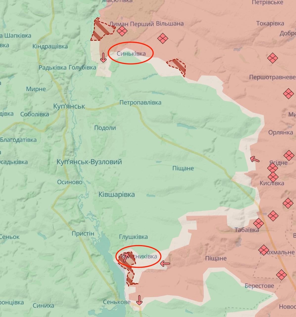 З півдня вдалося просунутися на 3,5 км у бік міста вздовж річки Оскол, майже захоплена Колесниківкою - вона вся знаходиться у сірій зоні або під контролем РФ. З півночі просування у двох місцях флангами Сіньківки. Мабуть, росіяни намагатимуться обійти її з двох сторін.