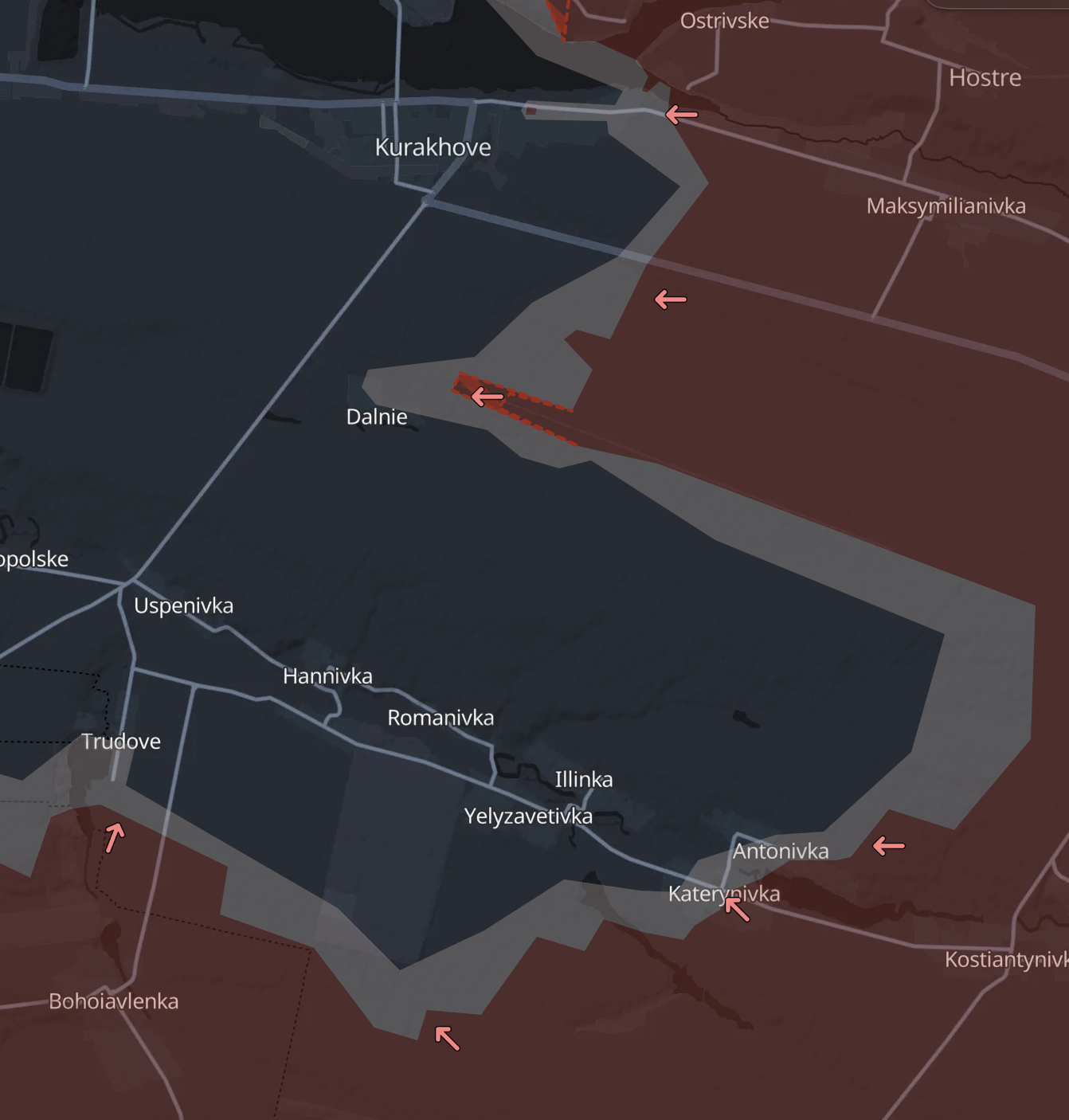 На південь від Курахового росіяни ще просунулися в районі села Дальнє. До траси, яка підходить до міста з півдня, їм залишилося менше кілометра, судячи з карти Deep State.