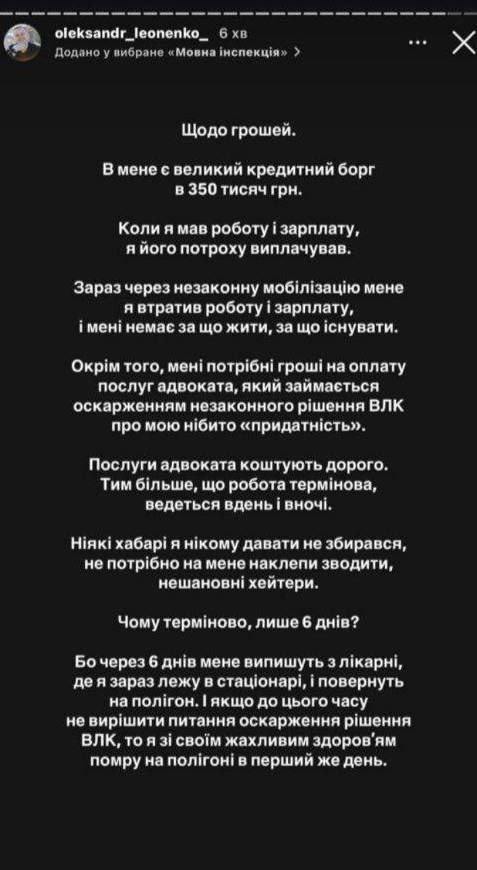 "Я працюю з адвокатом з оскарження рішення ВЛК, адвокат коштує дорого. Грошей у мене немає. Я в лікарні зараз у стаціонарі, дуже погано почуваюся. Поки я в лікарні, мені потрібно вирішити питання оскарження рішення ВЛК про мою придатність, тому що з моїми діагнозами я непридатний, ВЛК порушила закони", - написав Леоненко.
